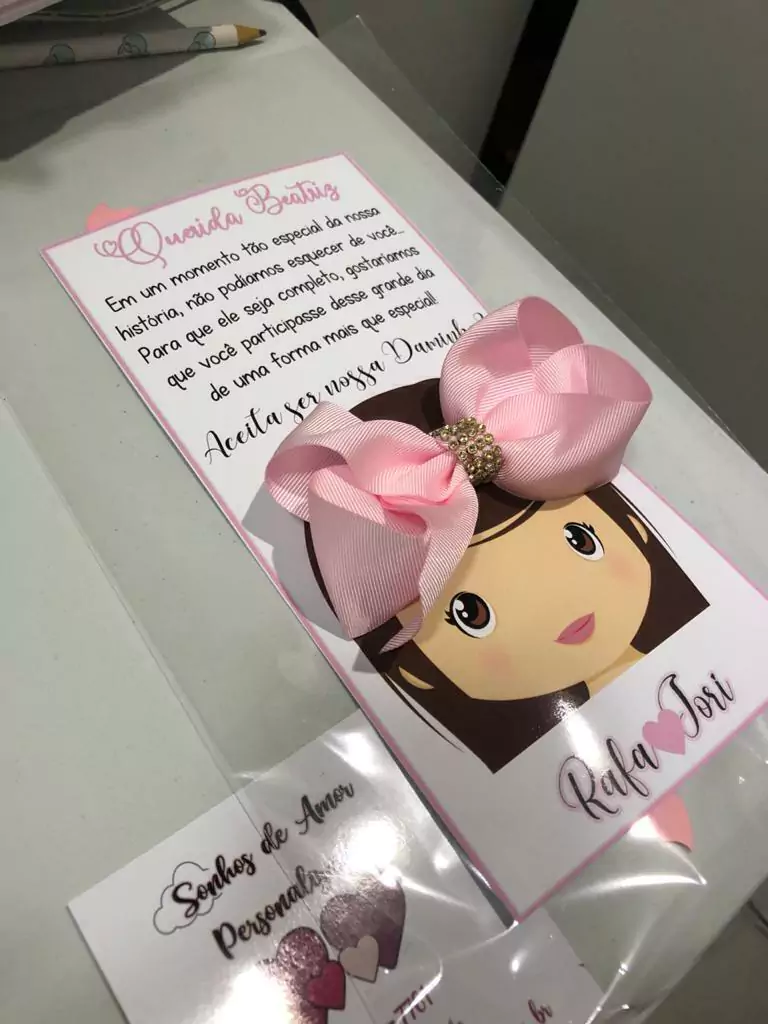 O kit para convidar suas daminhas, com o laço que as mesma já podem utilizar em seu casamento,